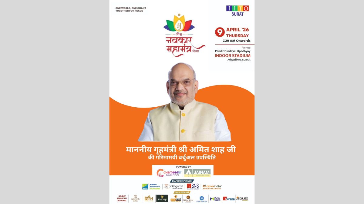 સુરત. વિશ્વ શાંતિ, અહિંસા અને આધ્યાત્મિક એકતાનો સંદેશ આપવાના ઉદ્દેશ સાથે 9 એપ્રિલ 2026, ગુરુવારે સુરતમાં વિશ્વ નવકાર મહામંત્ર દિવસ નિમિત્તે ભવ્ય સામૂહિક મહાજાપનું આયોજન કરવામાં આવ્યું છે. જૈન ઇન્ટરનેશનલ ટ્રેડ ઓર્ગેનાઇઝેશન (JITO) સુરત દ્વારા આયોજિત આ કાર્યક્રમ શહેરના ઇન્ડોર સ્ટેડિયમ ખાતે સવારે 7:29 થી 9:36 વાગ્યા સુધી યોજાશે, જેમાં મોટી સંખ્યામાં શ્રાવક-શ્રાવિકાઓ, યુવાનો, પરિવારો અને સમાજજન ભાગ લેશે.